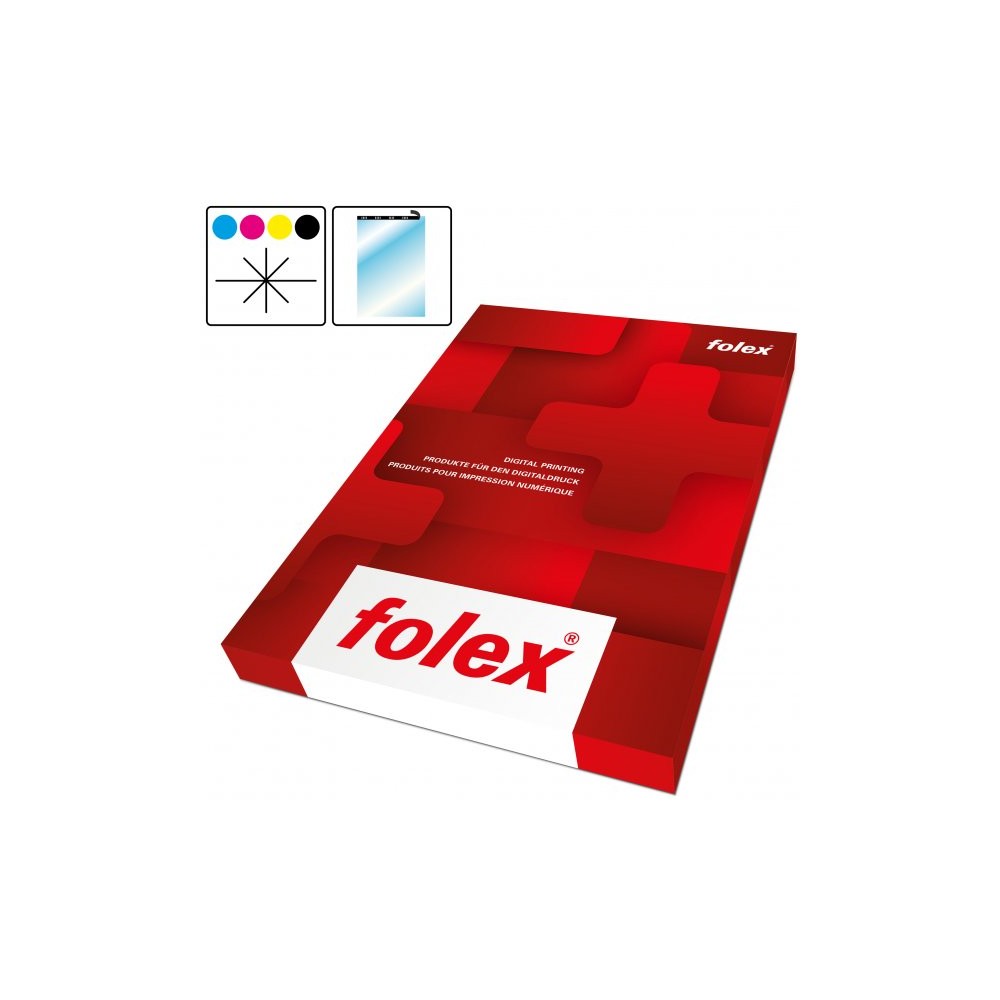 Folex es un film de poliester transparente. Es ideal para que las máquinas de impresión laser puedan reconocer las distintas hojas, al disponer de una banda de papel blanca en el lado corto de la hoja.La unidad de venta es la RESMA, que es el equivalente a 500 Hojas.